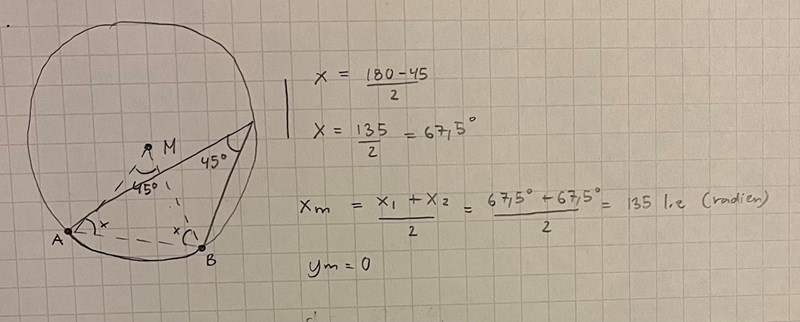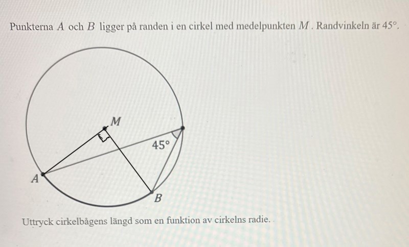 Hur vet du att vinkel M är 90 grader? Borde den inte vara 45 grader eftersom att det utgår ifrån samma cirkelbåge som vinkel 45 grader?