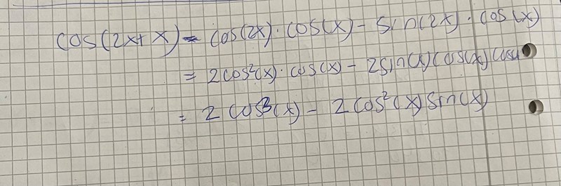 Ok. Du verkar ha använt formeln för cosα+β\cos\left(\alpha+\beta\right) fel. Dubbelkolla den först.