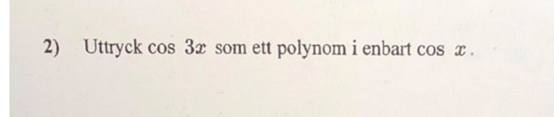 Det gäller att eix=cosx+isinxe^{ix}=\cos{x}+i\sin{x}. Det betyder att ei·3x=cos3x+isin3xe^{i\cdot 3x}=\cos{\left(3x\right)}+i\sin{\left(3x\right)} och Reei·3x=cos3x\text{Re}\left(e^{i\cdot 3x}\right)=\cos{\left(3x\right)}. Men du kan också uttrycka ei·3xe^{i\cdot 3x} som eix3\left(e^{ix}\right)^3. Ser du skillnaden? Nu är det bara att utveckla och jämföra.