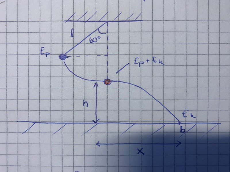 jag försöker lösa denna uppgift: "En pendelkula hänger i en tråd med längden l meter och släpps från utslagsvinkeln 60 grader. När kulan passerar det lägsta läget, vid läget h, brister snöret. Skriv ett algebraiskt uttryck för hur långt bort i horisontell riktning från detta läge kulan träffar golvet."