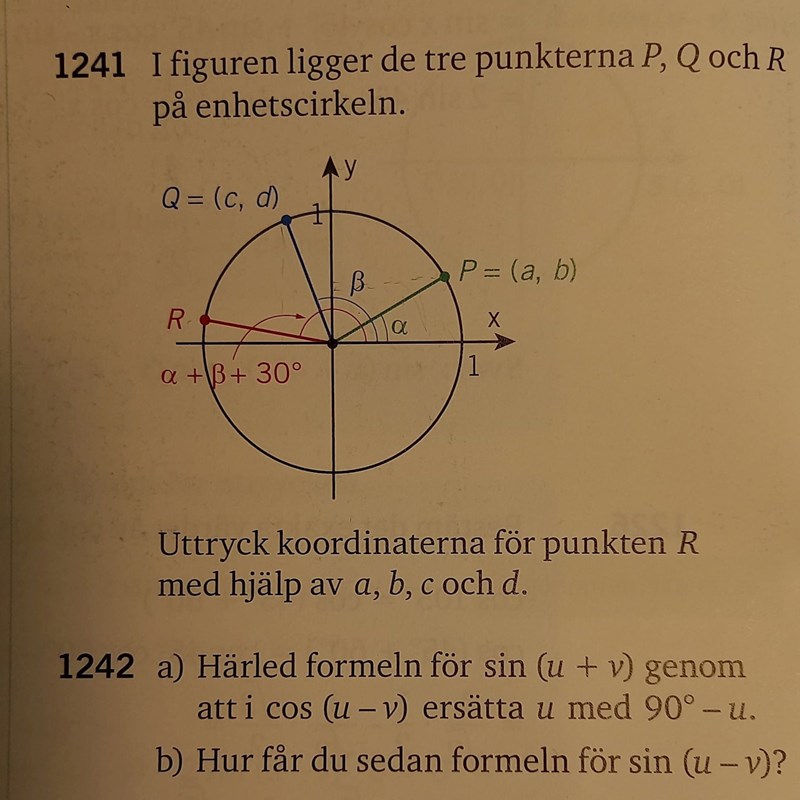 Uppgift 1241 kan du påbörja en lösning via additionsformlerna för sin(u+v) resp cos(u+v)