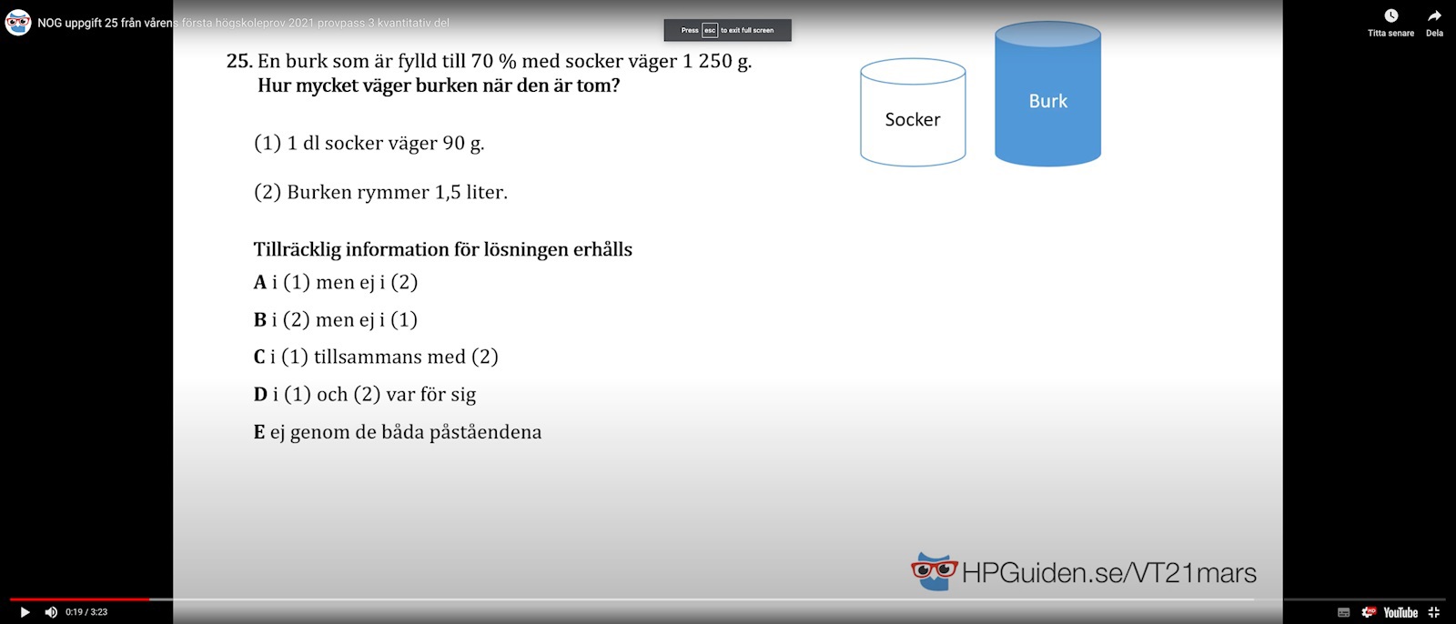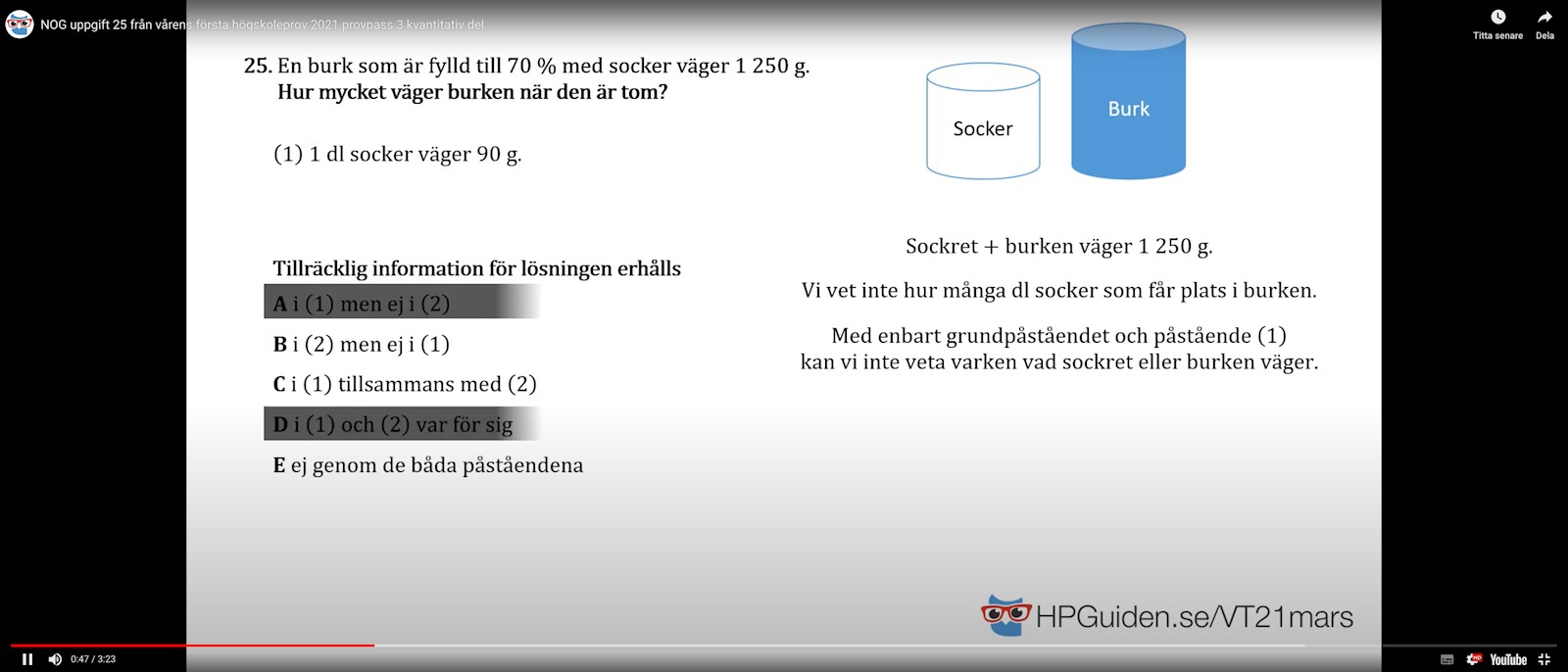 - Med hjälp av A och B har jag både densitet och volym hos sockret i en full burk. Då kan man räkna ut massan av det och sedan ta 70% av den massan. Den kan jag sedan använda för att räkna ut burkens massa. C är rätt svar.
