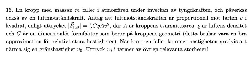 "Uttryck v0 i termer av övriga relevanta storheter. Dvs med storheterna du fått ska du bilda ett uttryck som ger enheten m/s.