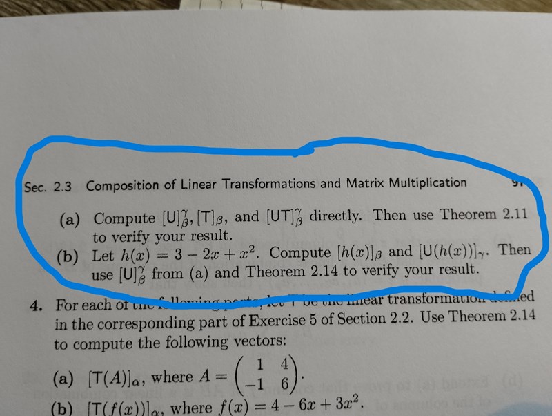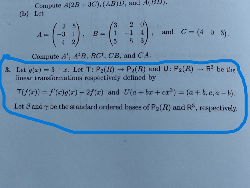 Jag behöver hjälp med följande uppgift. Jag fattar inte det här med två baser på samma matris? Att beräkna gick bra men blev inte rätt... Såhär gjorde jag: