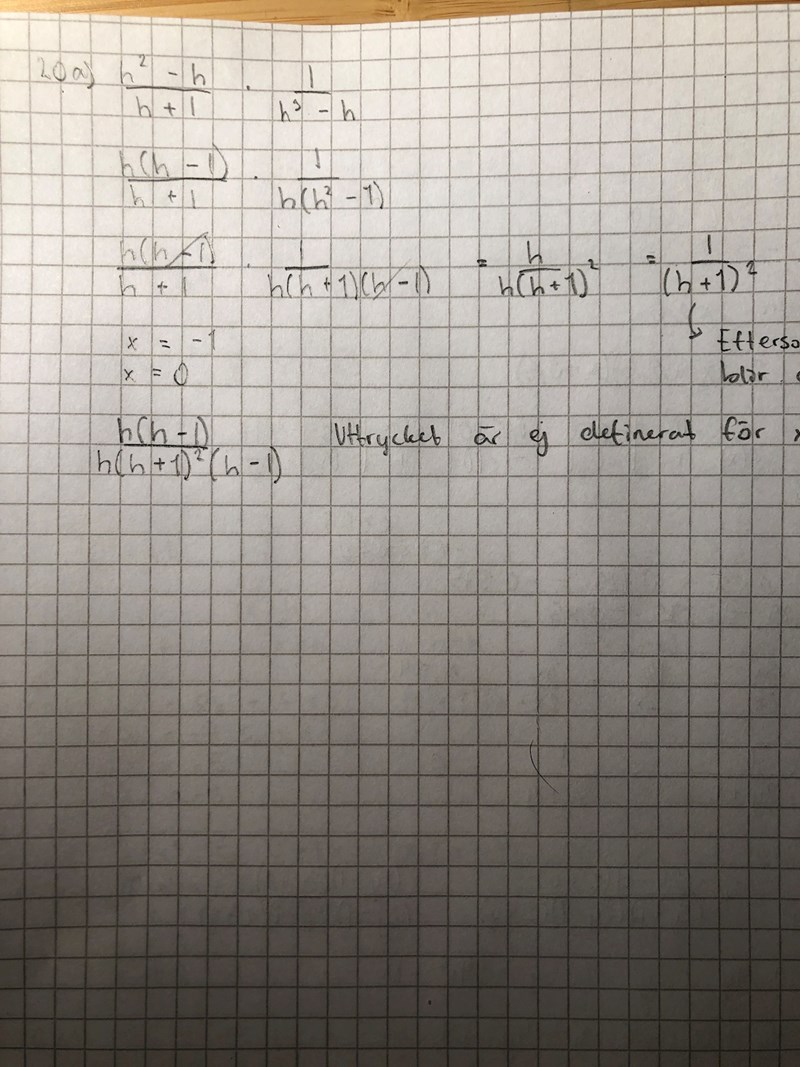 h(h-1)/h(h-1)(h+1) Av nämnaren ser man nu alla farliga värden och slipper missa något av dem. Sedan är det dessutom lätt att förkorta.