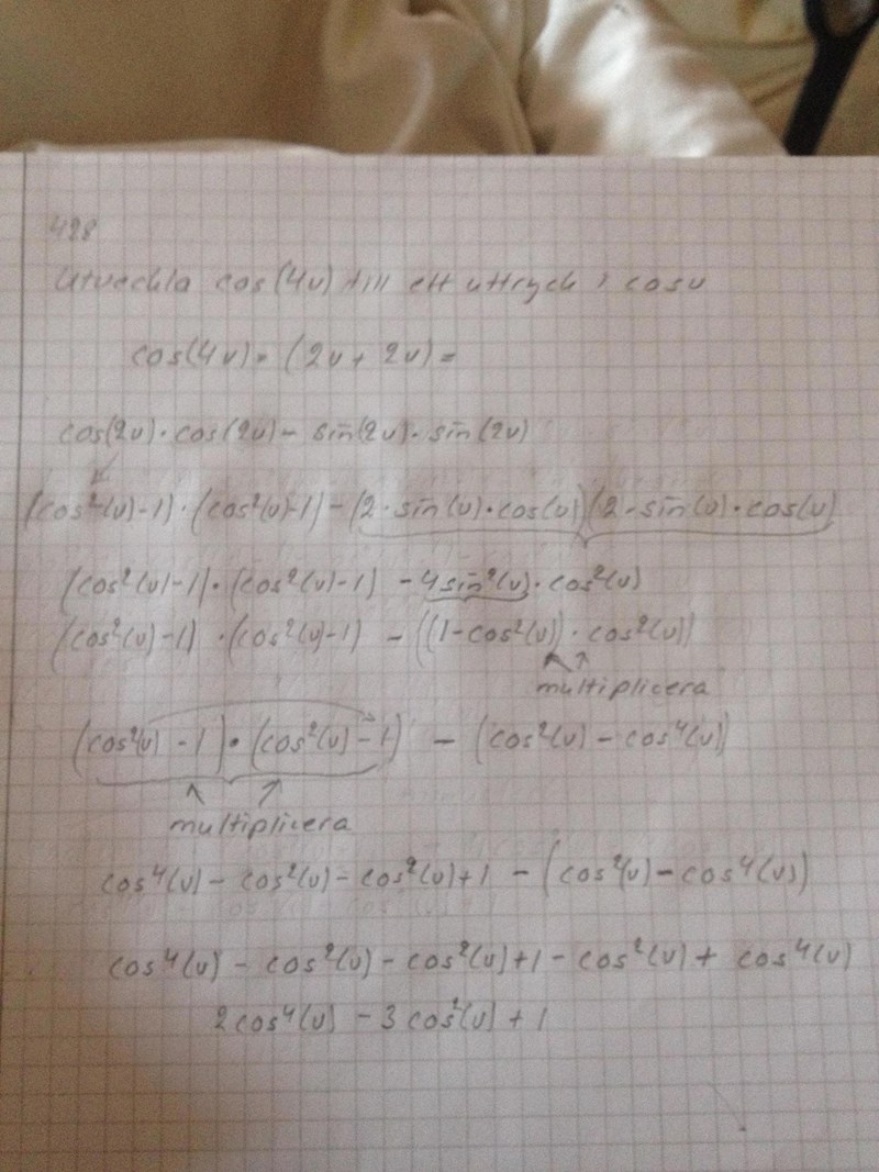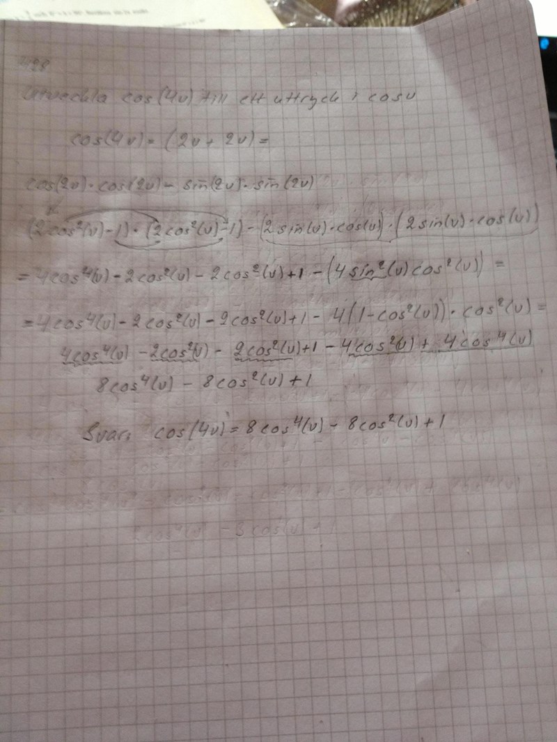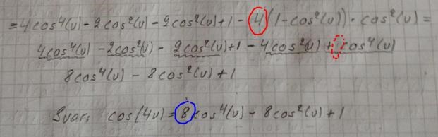 Du börjar alldeles vettigt med att skriva om cos(4v) till cos(2v+2v) och använda formeln för detta, men sedan vet jag inte vad det är du gör. Du borde använda den varianten av cosinus-för dubbla-vinkeln som bara innehåller cosinustermer (och en etta).