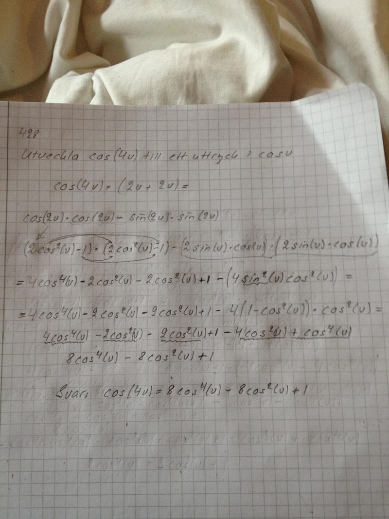 Jag skulle nog använt formeln för dubbla vinkeln i två steg: