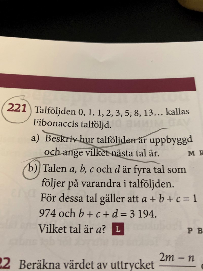 Jag har kommit fram till att a + b + c = 2(a+ b) och jag har kommit fram till att b + c + d = 2(b + (a + b))