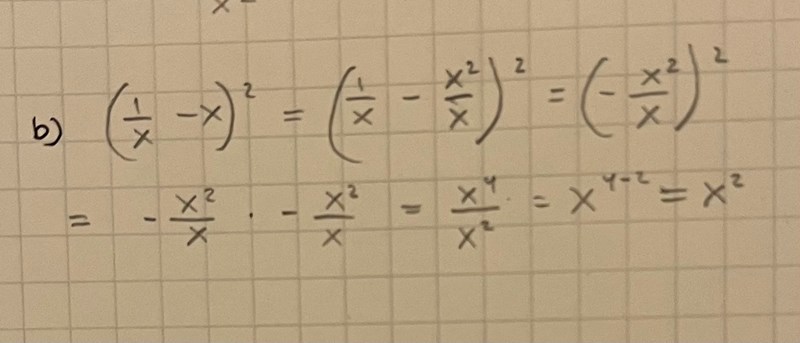 I uppgiften nedan ska jag utveckla uttrycket och skriva på ett gemensamt bråkstreck. Nedan kan du se hur jag har gjort. Problemet är att min lösning inte är korrekt och jag förstår inte riktigt vad för fel jag gör. Därför hade jag verkligen uppskattat om någon kunde förklara det för mig!