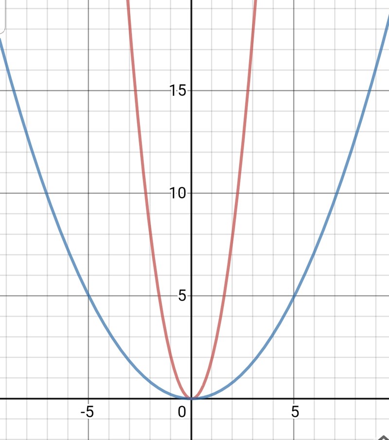 Exemoel: Röd parabel har a = 2, blå parabel har a = 1/5. Röd parabel är mer skålad/djupare/brantare än blå parabel.