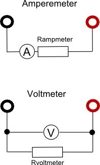 En ideal voltmeter har oändlig impedans, den mäter spänning utan att släppa igenom någon ström.