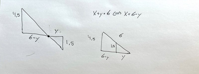 Om den ena katetern är 6 m så kan inte hypotenusan vara det men hypotenusan behöver du inte utan du använder likformighet mellan den stora och lilla triangeln. Det bygger på att de är rätvinkliga och delar på en vinkel.
