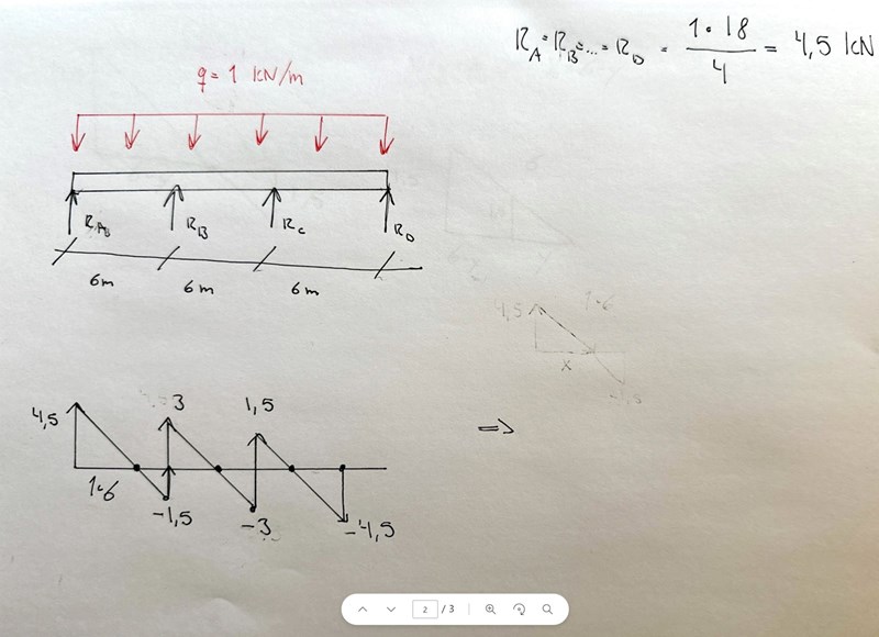 För att försöka förstå tekniken själv har jag skapat ett enkelt problem, vi har en kontinuerlig balk med 4 stöd, och en utbredd last på 1 kN/m. Mitt resonemang är att alla stödreaktioner måste vara lika stora, dvs. 4,5 kN. Utifrån detta kunde jag skapa diagrammet längst ner vilket ser korrekt ut jämfört med liknande V-diagram.