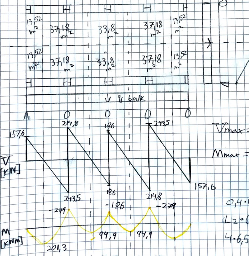 Jag förstår inte hur man resonerar för beräkningar som den nedanför. För laster och liknande måste man ofta hitta influensarea för balkuppsättningar, detta görs genom V- och M-diagram som i bilden nedanför. Och jag förstår inte hur man gör sånna. Min metod har förut varit att göra snitt mellan varje kraft och detta tar mycket lång tid, jag vet att det finns metoder som är mycket snabbare men har aldrig lärt mig.
