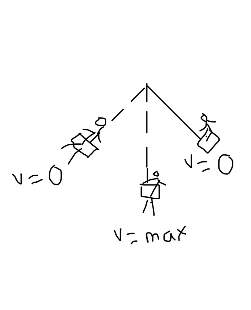jag ritade en bild på en person som gungar, och jag ritade ut bland annat när han är i sitt nedersta läge dvs i mitten. När du gungar och är precis i ditt nedersta läge så står väll gungan aldrig still. Gungan står snarare still i nån millisekund i sitt yttersta läge (som jag också ritade ut) precis när gungan ska vända och går från att ha en hastighet framåt till att ha en hastighet bakåt. Så när x = 0, är gungan i sina yttersta lägen.