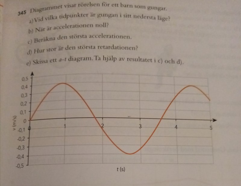 Ava.1 skrev:vad vi ser är ett vt-diagram. När gungan är i sitt nedersta läge så bör hastigheten vara som allra störst. Antingen kan du tänka att all lägesenergi då har omvandlats till rörelsenergi och att hastigheten således bör vara maximal. Annars kan du tänka att hastigheten är 0 i ytterlägena och således bör vara maximal precis i mitten.