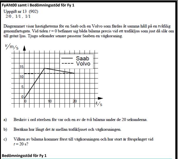 I b) så räknade jag sträckan mellan trafikljuset och vägkorsningen som 12.5 · 20 dvs Volvons hastighet · tiden. Det var fel, jag skulle räknat Saabens graf och fått 225m. Varför då?