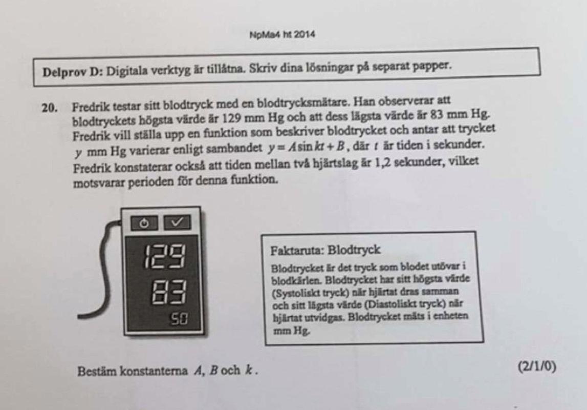 För att räkna ut k. k=2pi/T . T är perioden. A är amplituden och B är jämviktsläget.