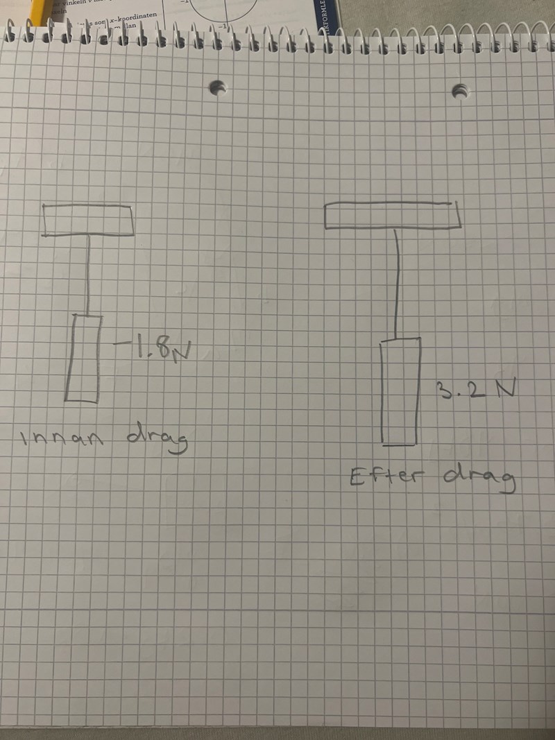 Räkna ut först massan om du inte har det med hjälp av figuren "innan drag" genom att använda f=mg. Kommer du vidare?