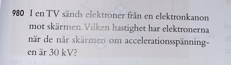 När en elektron accelereras av 30 kV får den energin 30 keV (kilo elektronvolt). Den kan man omvandla till joule. Sedan har du den vanliga formeln för rörelseenergi där du kan få ut hastigheten givet massan. (Här får man passa sig! Om hastigheten börjar närma sig 10% av ljushastigheten slutar den klassiska mekaniken att fungera och man måste ta hänsyn till relativistiska effekter. Det kanske är överkurs ännu?)