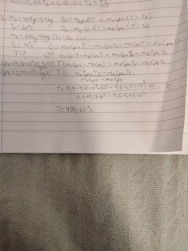 Tack för svar! Men varför ska det vara en addition i nämnaren? jag får det till minus när jag ser ekvationen:( eftersom jag adderar mvCpvTv till högerledet och meCpeTe är fortfarande negativ