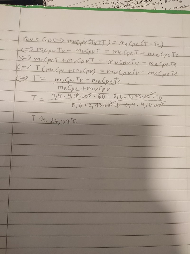 Nedan ställer jag först upp Qv = Qe. Nu har jag tagit Tv-T och T-Te eftersom vattnets temperatur kommer vara högre än sluttemperaturen medan etanolens kommer vara lägre än sluttemperaturen. På nästa rad multiplicerar jag in i parametrarna. På rad 3 adderar jag och subtraherar jag så jag får alla termer med T på ena sidan. På rad 4 bryter jag ut T och på rad 5 dividerar jag med meCpe + mvCpv så jag får T ensamt på ena sidan.