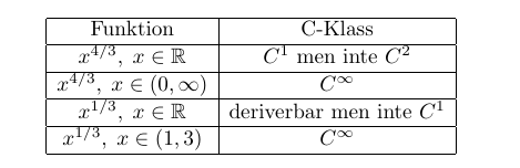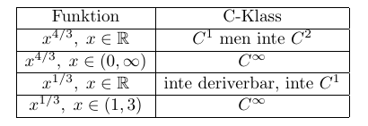 FunktionRegularitet\hlinex4/3, xC1 men inte C2\hlinex4/3, x(0,)C\hlinex1/3, xderiverbar men inte C1\hlinex1/3, x(1,3)C\[\begin{array}{|c|c|}\hline\text{Funktion} & \text{Regularitet} \\\hlinex^{4/3},\; x\in\mathbb{R} & C^1 \text{ men inte } C^2 \\\hlinex^{4/3},\; x\in(0,\infty) & C^\infty \\\hlinex^{1/3},\; x\in\mathbb{R} & \text{deriverbar men inte } C^1 \\\hlinex^{1/3},\; x\in(1,3) & C^\infty \\\hline\end{array}\]