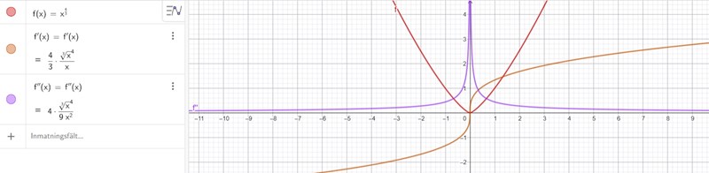 f'x=43x1/3f^\prime\left(x\right)=\frac{4}{3}x^{1/3} är inte deriverbar eftersom f''f^{\prime\prime} saknar derivata i x=0x=0.