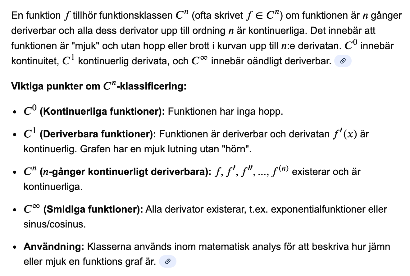 Såå ju om funktionen är så att säga exempelvis C47 så går det att derivera den 47 gånger och dess derivator är kontinuerliga men samtidigt så är dess derivator mjuka (d.v.s har kurvor) och ju mer vi deriverar desto mer kurva får den?