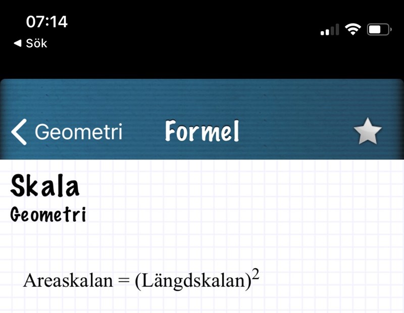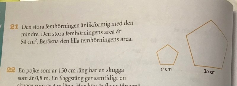 Den stora femhörningen är då 3 gånger större än den lilla? Om den storas area är 54 cm2, betyder det att den lilla femhörningens area är 54 / 3?