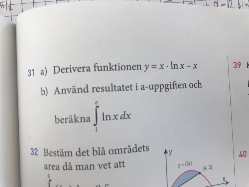 Okej. Eftersom jag ska använda resultatet i a), vilket var ln x så tänker jag att det blir: