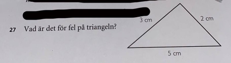 Hej! Jag behöver hjälp med att komma på vad som är fel på denna triangel, har försökt lista ut felet men kommer inte fram till någonting förutom att det är en trubbvinklig triangel (vilket inte borde vara ett fel). Om någon skulle kunna hjälpa mig lista ut felet på triangeln skulle det vara mycket uppskattat! (Det som är överstruket tillhör ej uppgiften.)