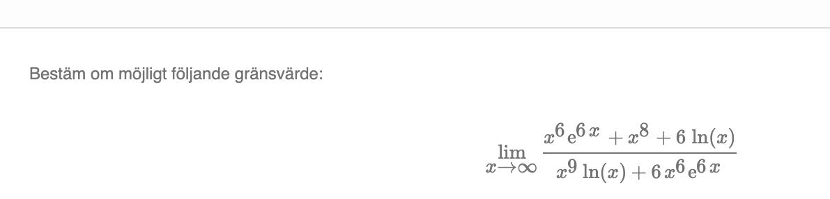 e6x dominerar, så gränsvärdet borde bli 1/6. Hur ser din desmos-plott ut?