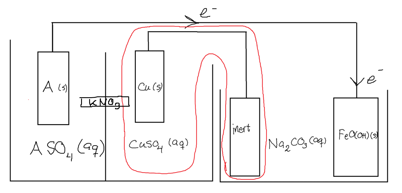 Du får ingen sluten krets utan det inringade området, det bildas ett överskott av positiv laddning längst till vänster i form av A2+(aq), dessa hindrar fler elektroner från att vandra och reducera FeOOH. T.ex. skulle sulfatjoner från CuSO4(aq) kunna vandra åt vänster för att motverka detta, men då har du ett överskott av positiv laddning vid kopparelektroden istället. Detta motverkas genom en reduktion där Cu2+(aq) tar upp elektroner som avges av den "inerta" elektroden.
