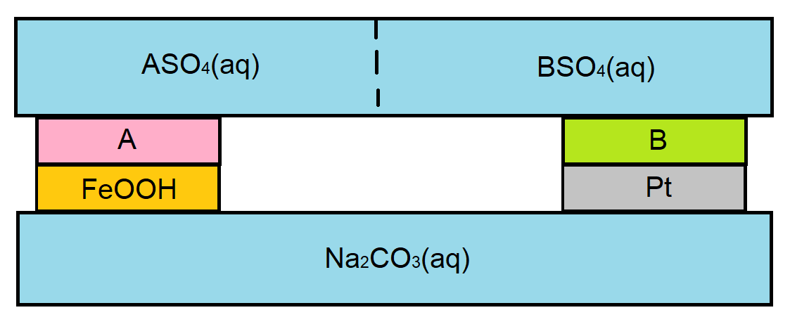Men varför ska man räkna på mellan A/B och FeO(OH)/Pt? Kanske är det så att det är mellan dessa reaktionerna sker "netto", men om man analyserar systemet så sker väl reaktionerna egentligen mellan A/FeO(OH) och B/Pt, alltså enligt hur de sitter ihop?