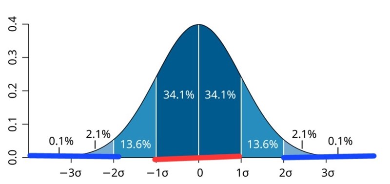 "Mer än två standardavvikelsen frön medelvärdet" innebär och , dvs 0,1 % + 2,1 % + 2,1 % + 0,1 %.