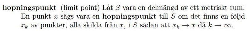 dr_lund skrev:I kursen Analysens grunder brukar man definiera begreppet hopningspunkt: