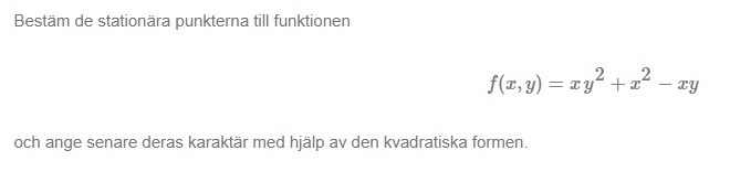 Sykey skrev:Jag förstår inte vad en stationär punkt är eller hur man anger funktionens karaktär m.h.a kvadratisk form. Jag antar att det är andra derivatan eftersom den brukar ange en funktions karaktär men idk.
