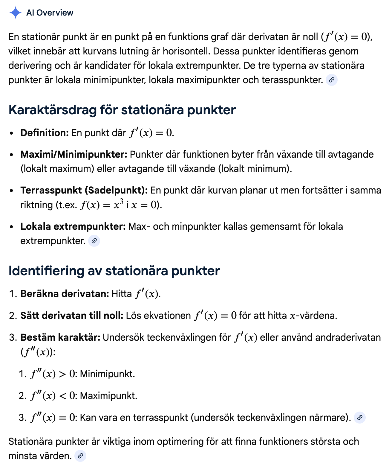 Aha så derivatan är 0 och därför blir punkten en stationär punkt? Jag fattar inte är inte egentligen alla punkter en funktion bestämda (i rummet) och därmed alla stationära? Punkten rör ju inte på sig.