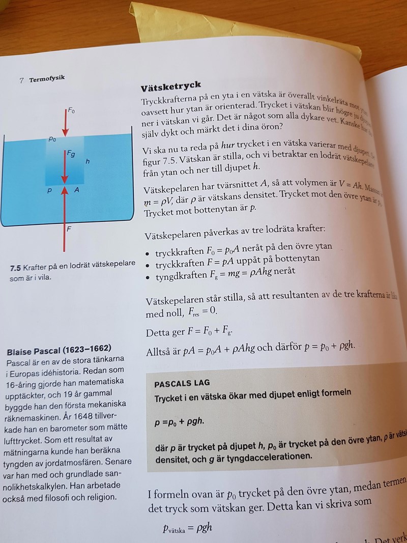 haraldfreij skrev:En vätskepelare är en tänkt pelare (långsmalt "rör") med vätska. Den har ingen egentlig gräns mot omgivande vätska, men eftersom vattnet står stilla kan vi betrakta den som en sammanhängande kropp.