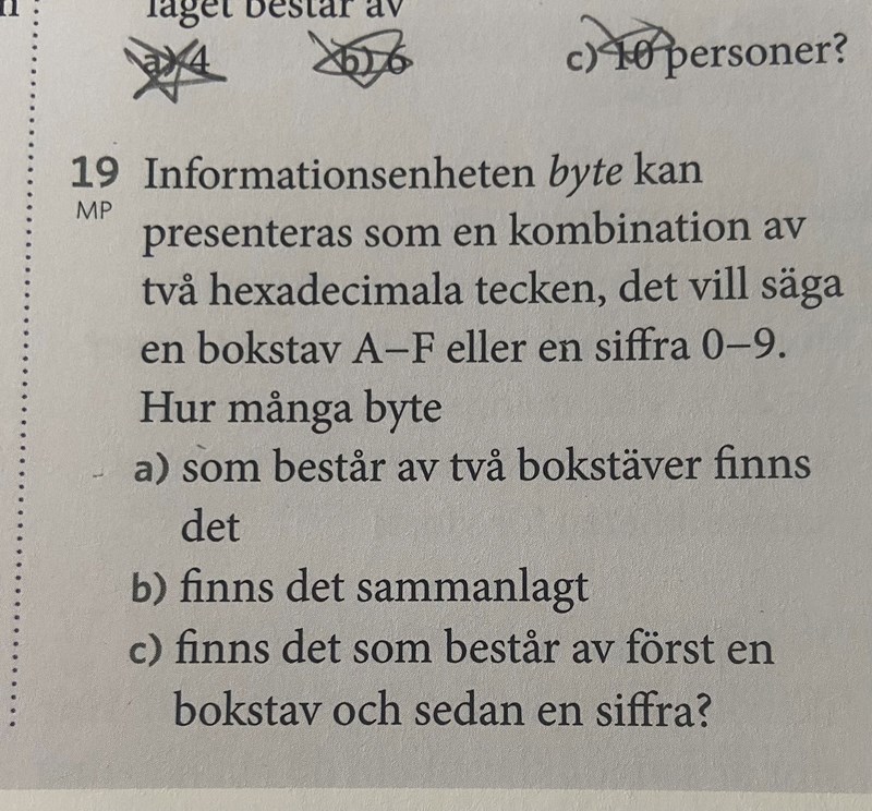 Det som efterfrågas i a-uppgiften är hur många sådana kombinationer som enbart består av två bokstäver. Exempel på sådana är AE, FC, BB och så vidare.