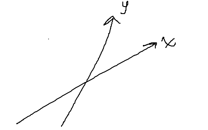 Hur kan vi gå från den här abstrakta definitionen till att faktiskt åskådliggöra vårt "koordinatsystem"? Exempelvis, hur vet vi att vektorrummet med den vanliga basen ska åskådliggöras som två vinkelräta linjer istället för kanske två linjer som korsar varandra så här: