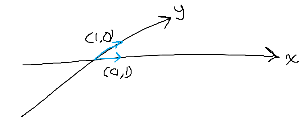 Jag har svårt att förklara vad jag menar och alla formuleringar jag kommer på låter bara dumma, så jag testar att bara ställa en fråga istället så får vi se vart det leder. Finns det något, rent principiellt, som hindrar oss från att rita vårt koordinatsystem så här, då vi jobbar i med standardbasen: