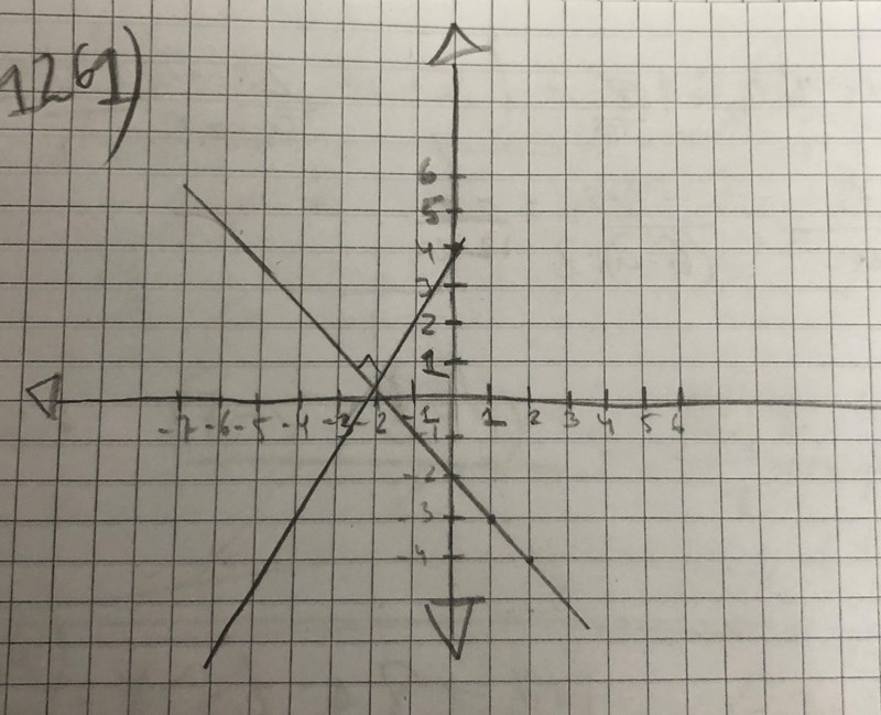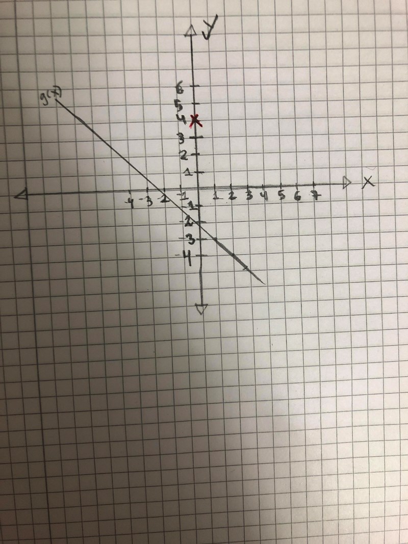 Det jag hittills har lyckats med är att rita ett koordinatsystem, pricka in (0,4) och rita grafen till g(x)=-x-2.