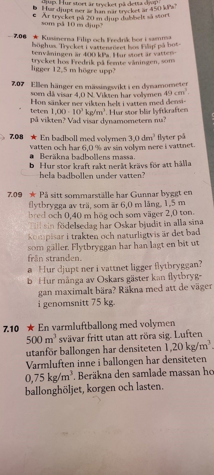 7.09 B) frågan, så tar jag hela bryggans volym multiplicerat med densiteten på vatten mulriplicerat med gravitations konstanten sedan delar jag det med 75kg*gravitations konstanten. Motiveringen är att när hela bryggans volym har trängt bort vatten är den precis under vatten ytan. Och det är max.
