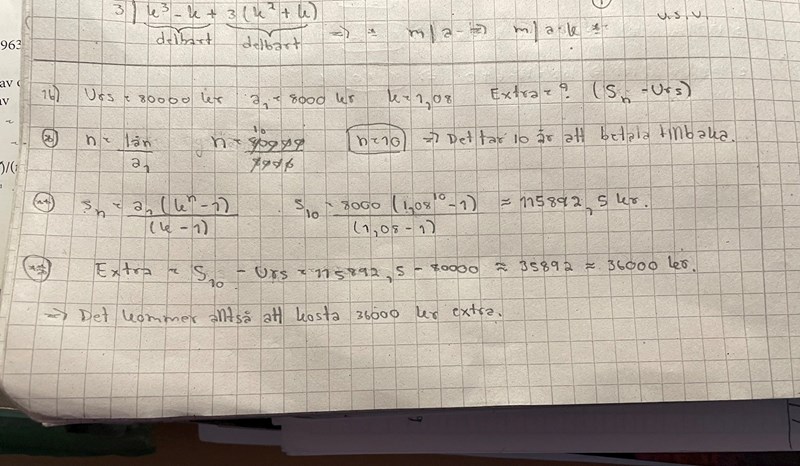 ”Amir lånar 80000kr till en bil. Varje år amorterar han 8000kr och betalar dessutom ränta på 8%. Hur mycket kommer lånet att kosta honom?”