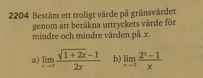 Har en fundering kring uppgift 2204. Jag löser uppgiften på 2 olika sätt och får 2 olika svar. Vet att metoden s ger svaret 0.693 är rätt. Men däremot undrar jag varför min andra metod ger fel svar. Jag använder mig av konjugatregeln och får att gränsvärdet är 1.