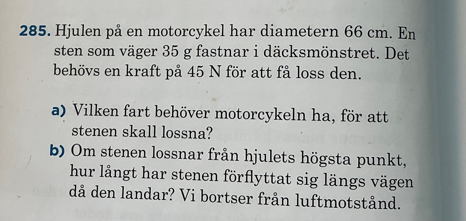 Från a uppgiften fick jag fram motorcykelns hastighet till 20,59 m/s, vilket stämmer enligt facit. För b uppgiften tänker jag att då stenen lossnar från den högsta punkten har den en horisontell hastighet på 20,59 m/s. Samtidigt faller den nedåt där sträckan utgörs av hjulets diameter, dvs. 0,66 m. Jag sätter upp rörelsefunktioner och beräknar stenens totala tid i luften till 0,36 s, vilket stämmer. Jag multiplicerar därefter tiden med stenens horisontella hastighet för att beräkna sträckan. Jag får den till 7,5 meter, svaret är 15 meter (dvs. den dubbla sträckan). Vad gör jag fel?