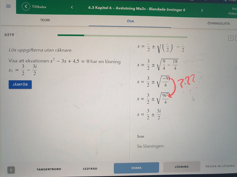 Vad man då gör när man får ett negativt tal under ett rottecken är att bryta ut -1, byta ut det mot i2 och sedan räkna på som vanligt.