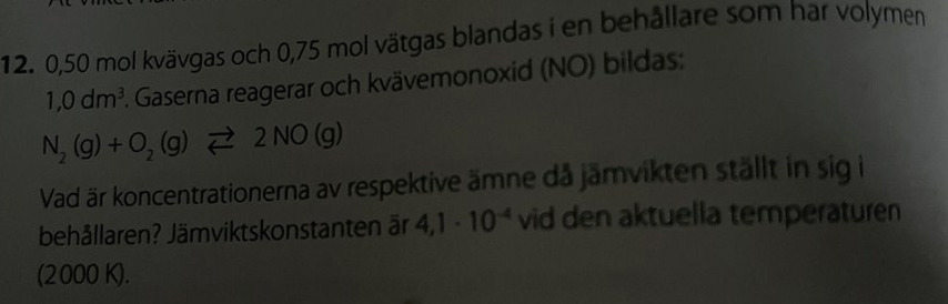 Börja med att göra en tabell över substansmängder/koncentration (det blir samma sak, eftersom volymen är 1 dm3) det är dels från början, dels vid jämvikt (antag att x mol kvävgas reagerar med x mol syrgas). Använd uttrycken du får fram i jämviktskonstanten, och räkna ut x.